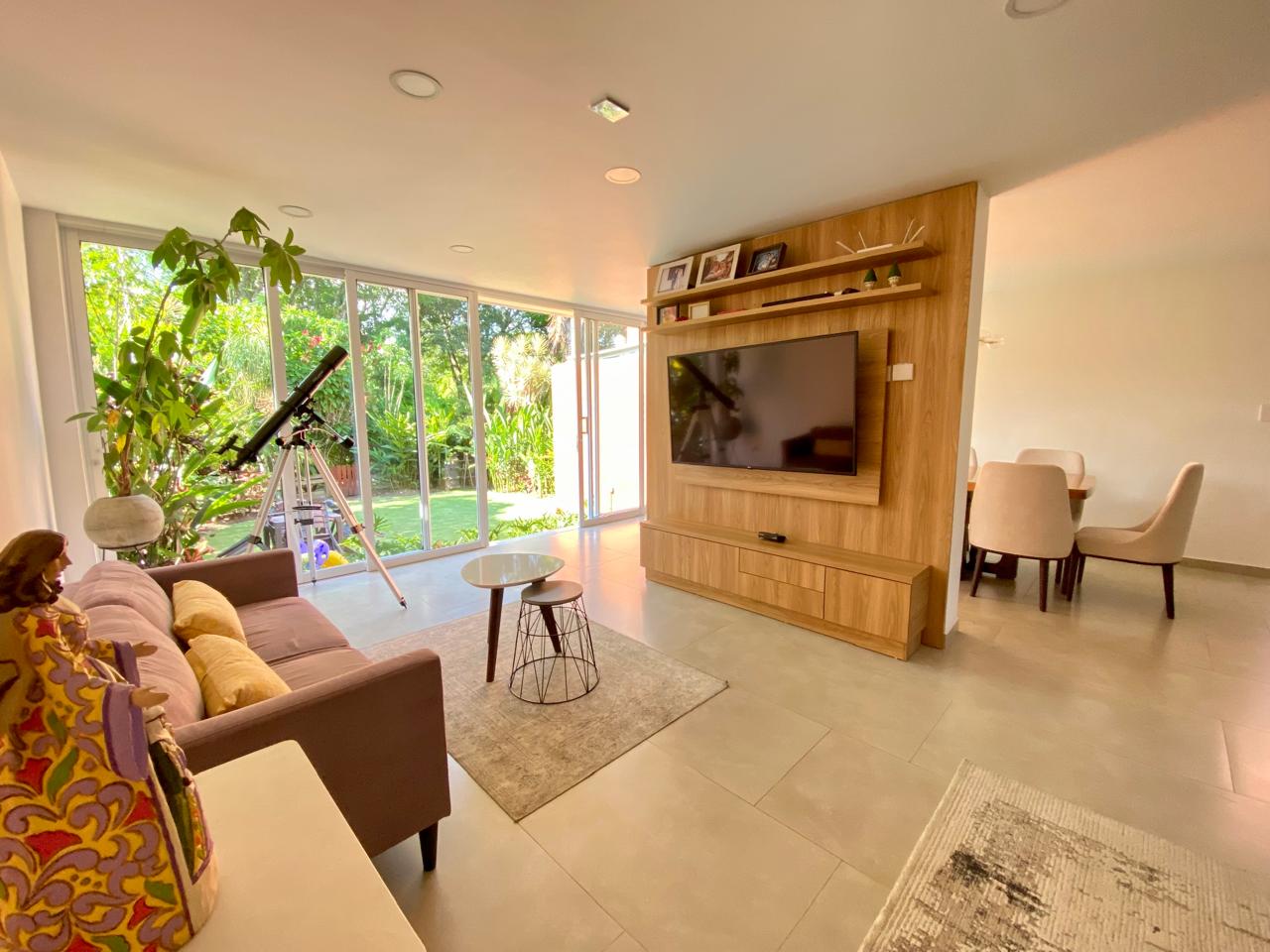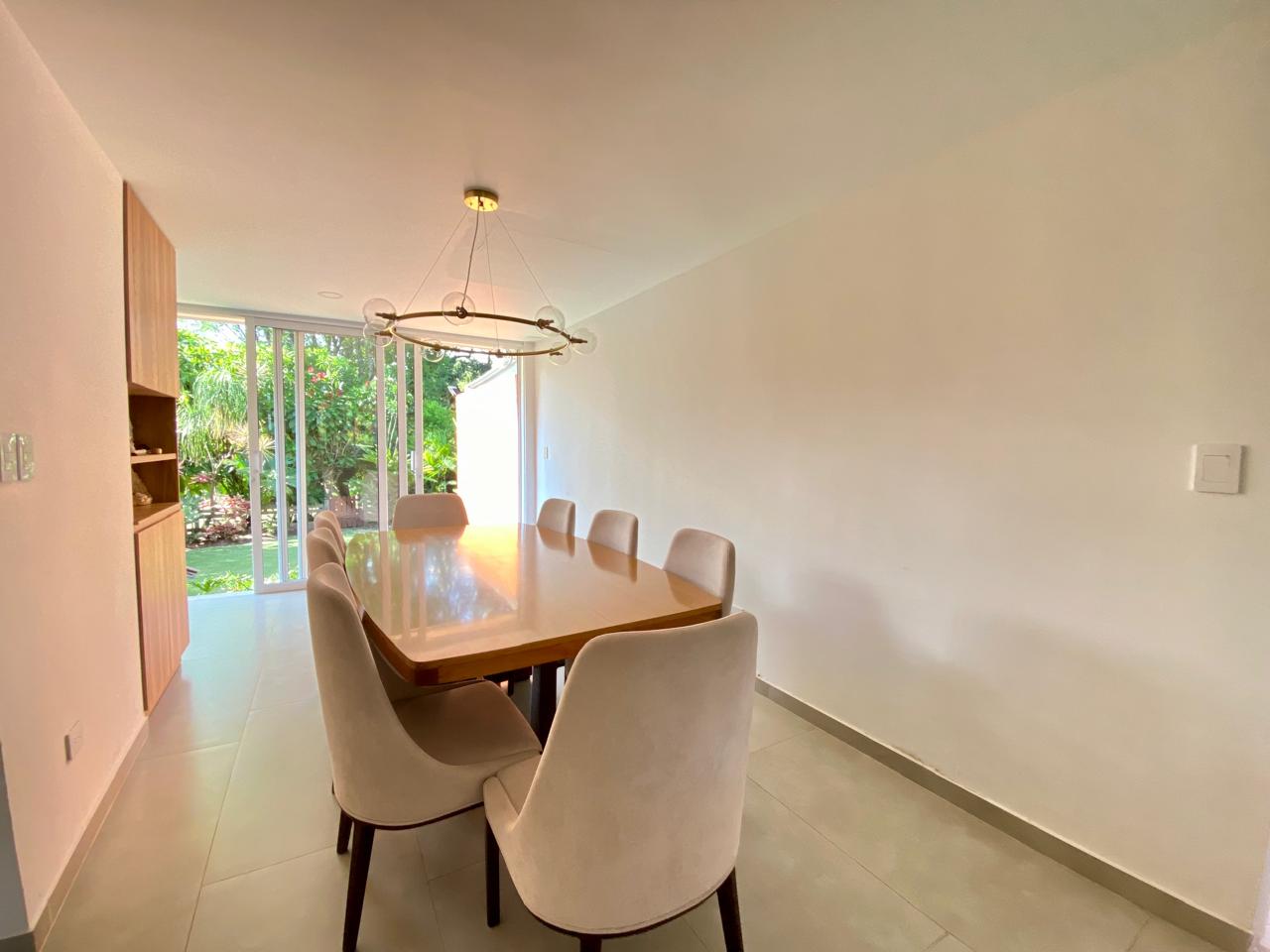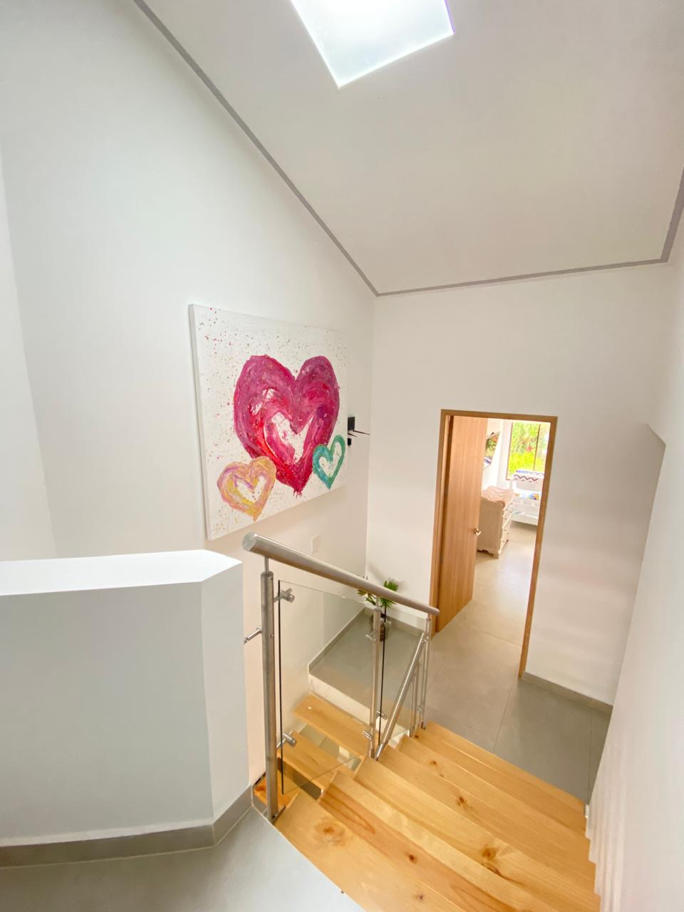 Casa contemporánea con excelentes acabados, en Condominio Campestre, sector de la Riverita. Consta de lote de 220 m2 y construidos 210 mt2, Amplia Sala, comedor independiente, hall de tv, estudio, Cocina americana, zona de ropas, cuarto del servicio con baño, baño social, zona verde rodeada de árboles y vista preciosa. Segundo nivel: 2 cuartos con baño y vestier, cuarto principal muy espacioso, aíre acondicionado. 3er nivel: Cuarto con baño y preciosa vista. Condominio con excelentes y amplias zonas verdes, piscina, juegos para niños, alta valorización, 2 parqueaderos.